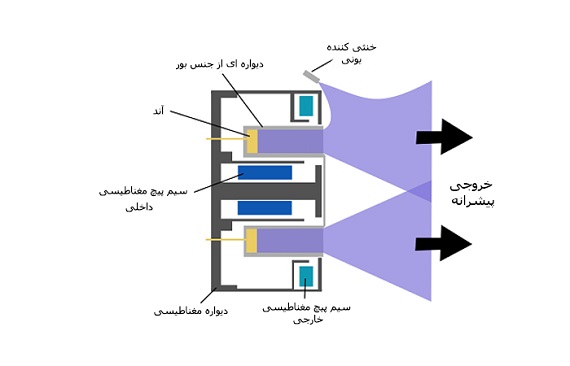 دراین طرح، از اجتماع الکترونها که توسط میدان مغناطیسی به دام افتاده بودند، کاتد به صورت مجازی تشکیل میشود، از طرف دیگر به علت سنگینتر بودن یونها از الکترونها، آنها در دام میدان مغناطیسی گرفتار نمیشوند و پس از خنثی شدن توسط پرتوی مغناطیسی، به سمت خروجی پیشرانه رفته و باعث حرکت موشک میشود.